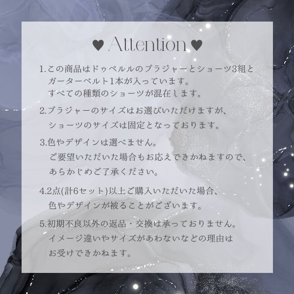 豊富なデザインの中から、ブラジャーとショーツのセット×3組、計3セットに今回は特別にセットのガーターベルト1点が入ったスペシャルバッグです♡
