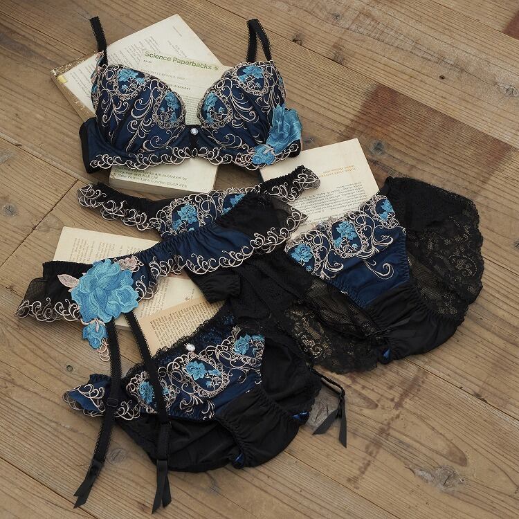 ブルーのカメオのチャームを中心に飾れば骨董品のように美しいランジェリーの出来上がり。